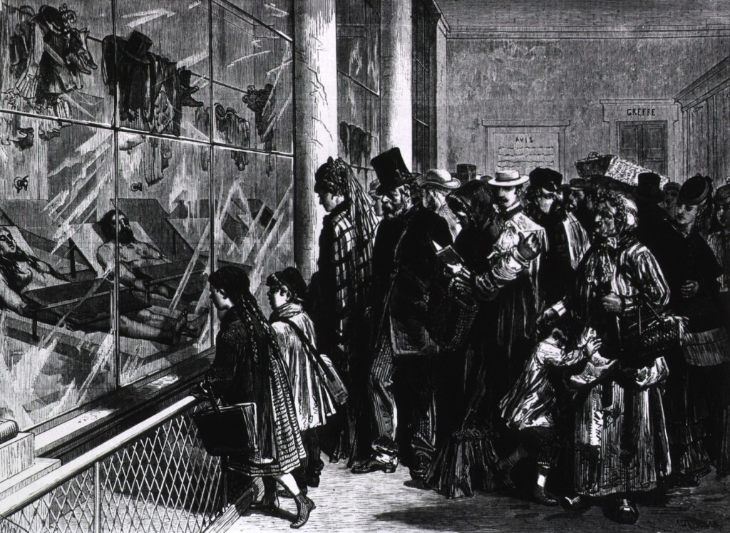 Morgues in late 19th century Paris were hot travel destinations. In a time well before DNA forensics, bodies were laid out on slabs in front of windows. The public could line up and gaze freely upon the bodies, hopefully identifying the victims in the process. Most people attended these spectacles out of sheer curiosity. Food and toys were sold outside and children were permitted inside the viewing rooms. These events were termed, “spectacles of the real.”