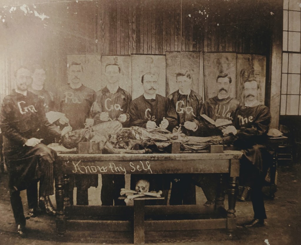 It’s easy to imagine why medical students would use macabre humor to lighten the mood of their, oftentimes, morbid surroundings. It is not uncommon in anatomy photos to find a skeleton with a pipe in it’s mouth, corpses posed to look alive, or, as seen above, students reversing roles. The use of humor probably served as a stress reliever, helping the men and women deal with their own identity struggles and allowed them to detach emotionally from their work.