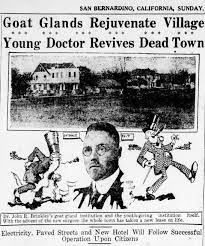 John Romulous, later changed to John R. Brinkley, was born in North Carolina in 1885. He was orphaned at a young age but he wished to one day become a doctor like his father. Brinkley attended medical school in Kansas, but never finished. Instead, he obtained fraudulent credentials and began practicing medicine. Between 1917 and into the 1930s, John Brinkley was making a fortune on his “revolutionary” surgical procedure which involved placing goat testicles into men’s scrotums to cure infertility and improve virility (Pilkington). Men were paying him upwards of $750.00 to have this done to them. For patients with more money to spare, he offered to transplant the testicles of death row prisoners. At the height of his career, Brinkley had around 50 new excited patients to see each week (Weiser-Alexander).