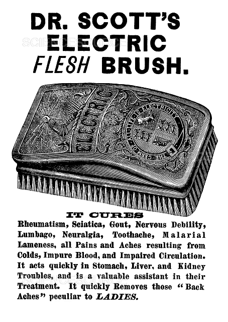 George Scott was an English businessman who had no formal medical training whatsoever, yet he made a killing off of several “medical” devices he had invented for home use. He received his first U.S. patent for a molded hairbrush handle in 1872 and officially released his electric hairbrush in 1880. The brushes and his other products were not actually electrified, they were magnetized. A slightly magnetized iron rod was embedded into the plastic brush handle. His patent request contained the following statement: “The object of the invention is to secure within the interior of the brush one or more natural or artificial magnets, which, according to the belief of many persons, founded upon a theory of magneto-therapeutics which has become widely prevalent, have the effect of rendering brushes to which they are applied advantageous in use for relieving headache, preventing baldness, and other similar purposes.” It does not necessarily make a direct claim to be a medical device but later advertisements do specifically say that the “electrified” products could cure rheumatism, sciatica, gout, neuralgia, toothache, baldness, malarial lameness, aches and pains, impaired circulation, backaches, premature gray hair, constipation, paralysis, headaches, and more.
