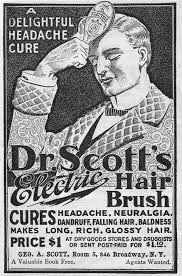 The 19th century was overloaded with wacky tonics, devices, and medical schemes . Business Men everywhere hoped to corner the healthcare market and to get rich quick with their crowd-appealing slogans and unrealistic promises of restored health and rapid remedies. One especially creative man, George A. Scott became wealthy with the release of his electric products that promised to cure everything from baldness to gout.