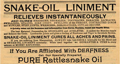 - “Friedman, Jordan. “How Snake Oil Became a Symbol of Fraud and Deception.” Smithsonian Magazine. October, 21, 2024. Accessed 5 February, 2025. https://www.smithsonianmag.com/innovation/how-snake-oil-became-a-symbol-of-fraud-and-deception-180985300/.